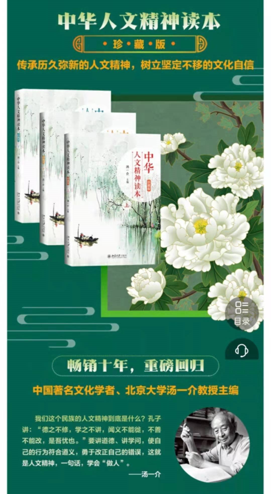 《中华人文精神读本》是由北京大学出版社出版、北京人民广播电台悦库时光文化传媒制作的精品有声读物,由著名中国文化学者、北京大学教授汤一介主编,著名播音艺术家张震播讲。